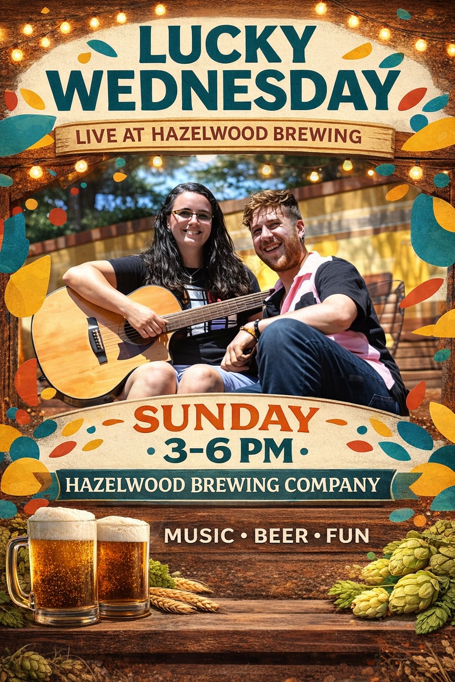 Slide into Sunday with the smooth, feel-good sounds of Lucky Wednesday at Hazelwood! This dynamic duo brings an easygoing blend of acoustic vibes, catchy melodies, and laid-back energy that’s perfect for winding down the weekend.