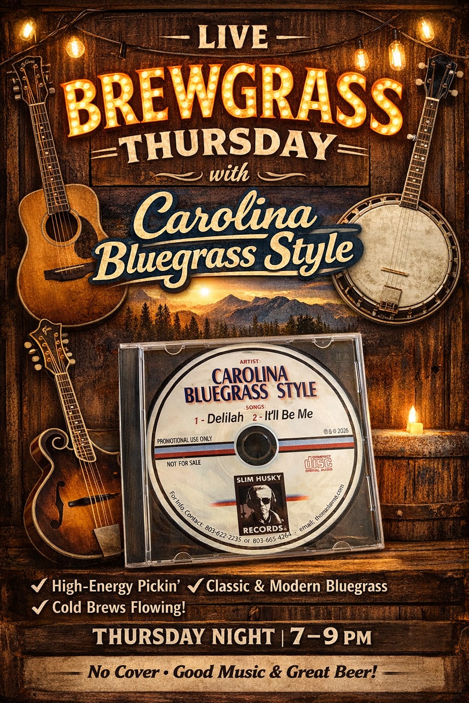 Join us for a night of foot-stompin’, hand-clappin’, ice-cold beer drinkin’ fun as Carolina Bluegrass Style brings their signature sound to the stage! From fast pickin’ classics to modern bluegrass grooves, this is the kind of live music that turns a casual night out into a full-on good time.
