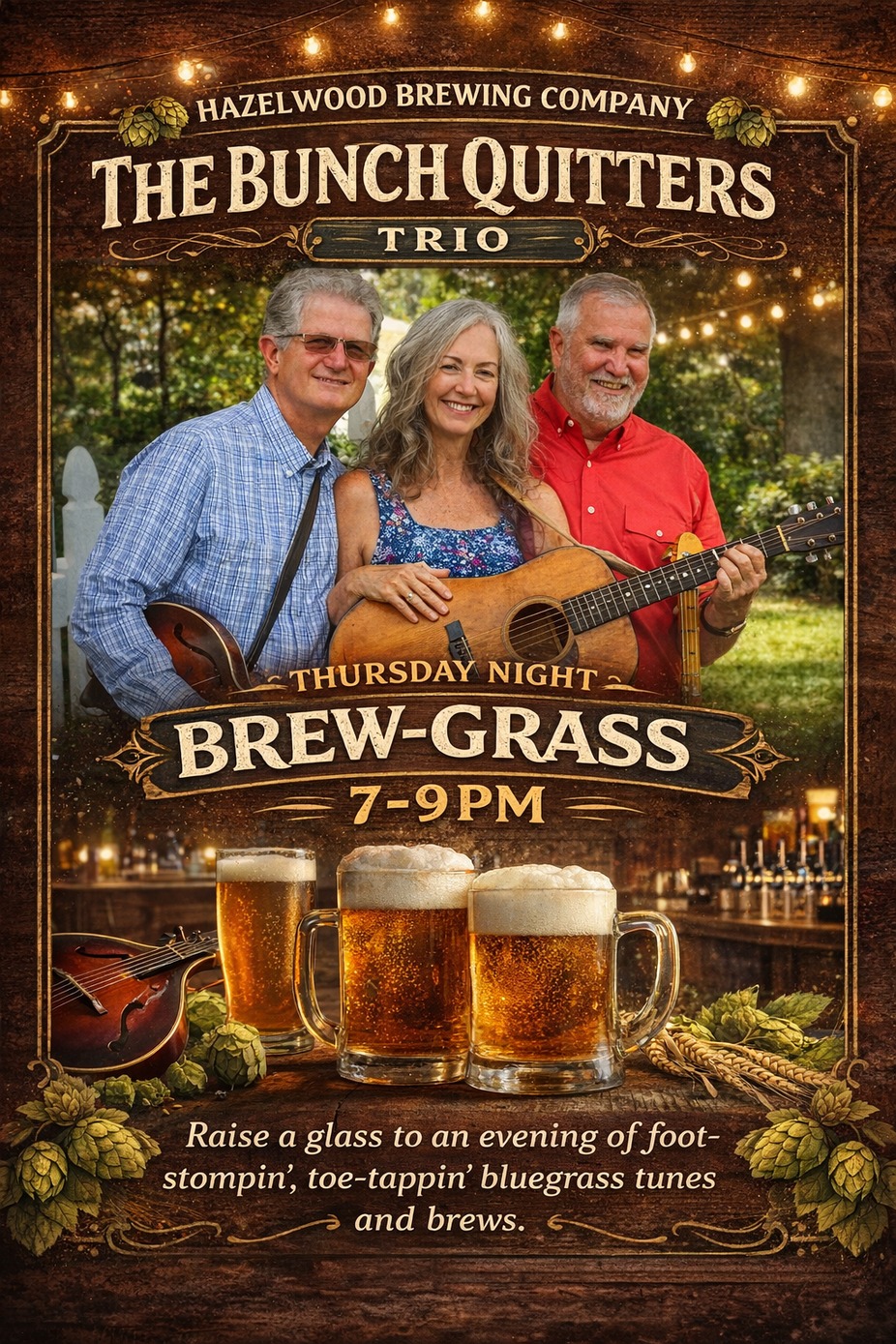 Kick off your weekend early with an evening of feel-good, foot-stompin’ bluegrass at Hazelwood! The Bunch Quitters Trio brings a warm, easygoing sound packed with rich harmonies, acoustic charm, and the kind of energy that makes you want to stay for “just one more.”