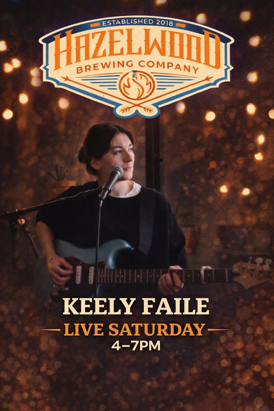 Ease into your Saturday with the smooth, soulful sound of Keely Faile at Hazelwood. With her rich vocals and laid-back guitar style, Keely brings the perfect blend of indie, acoustic, and feel-good vibes that pair perfectly with a cold pint.