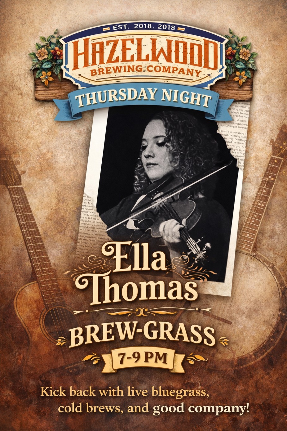 Kick back and let the week roll into the weekend with Thursday Night Brew-grass, featuring Ella Thomas live from 7–9 PM.